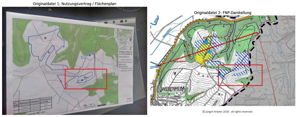 Dokumentiert ist ferner, dass die Grundstücke 4900/1 und 4900/2 Gegenstand des vorliegenden Grundstücksnutzungsvertrages sind, wobei es sich hierbei nicht um den eigentlichen Maststandort, sondern um den Bereich des Rotorüberschlags handelt. Gerade dieser Umstand bildet einen bereits fortgeschrittenen technischen Planungsstand deutlich ab, da hieraus hervorgeht, dass konkrete Anlagenparameter und die räumliche Reichweite des Rotorkreises bereits vor einer Beschlussfassung des Stadtrates in die vertragliche Flächenansprache eingeflossen waren. Dies verstärkt den Verdacht einer bereits weit fortgeschrittenen und räumlich konkretisierten Standortplanung erheblich. Von besonderer Bedeutung ist hierbei, dass der ausgewiesene Standort WEA 2 auf oder unmittelbar am Grundstück der betroffenen Eigentümerin liegt, der bereits vor einer Beschlussfassung des Stadtrates ein konkreter Grundstücksnutzungsvertrag unterbreitet wurde (siehe nachfolgende synoptische Gegenüberstellung – Abb. 1). Der unmittelbare räumliche Zusammenhang zwischen Vertragsansprache, Grundstückslage und ausgewiesenem Anlagenstandort erhärtet den Verdacht einer bereits vor Abschluss des planerischen Verfahrens konkretisierten Standortkonzeption.